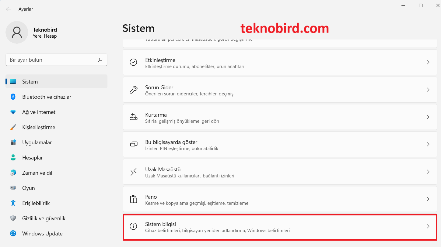 - Sağ tarafta yer alan Sistem Bilgisi sekmesine tıklayın.