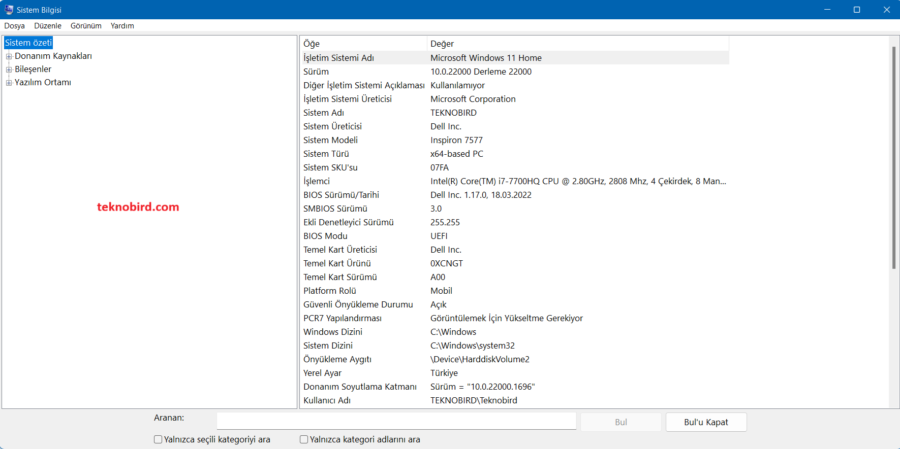 Yöntem 2: Sistem Bilgileri Aracı ile Detaylı Donanım Bilgileri Öğrenme