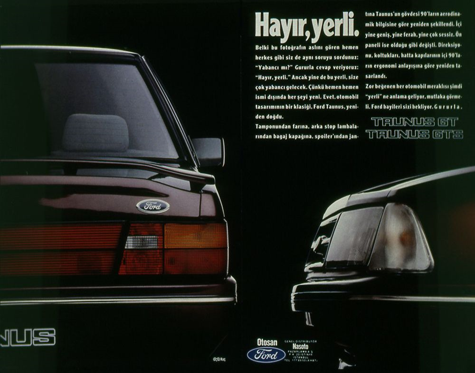 Arabesk furyası. Ülkede döviz var. Köşeyi dönme çabası, hayali ihracat. Artık araçlar daha teknolojik. Popüler kültüre bağlılık iyice artmaya başladı. Taunus’u olan biri Renault’u olan birinden daha güçlü. Çünkü bu araba daha modern, daha teknolojik, daha pahalı. Rekabet artıyor fakat amaç hala araba satmak. Bunu alırsan güçlüsün ama diğerini alırsan zayıfsın algısı. Değişen şey nedir peki? Teknolojinin bir tık daha fazla olması. Orantı aynı, amaç aynı. 80’li yıllarda arabanda çakmak varsa insanları etkilerdin, 90’larda ise araban daha sessizse, daha hızlıysa etkiliyorsun. İnsanları etkilemek sana; senin güçlü olduğunu hissettiriyor. Popüler kültür kana karışmaya başlıyor…
