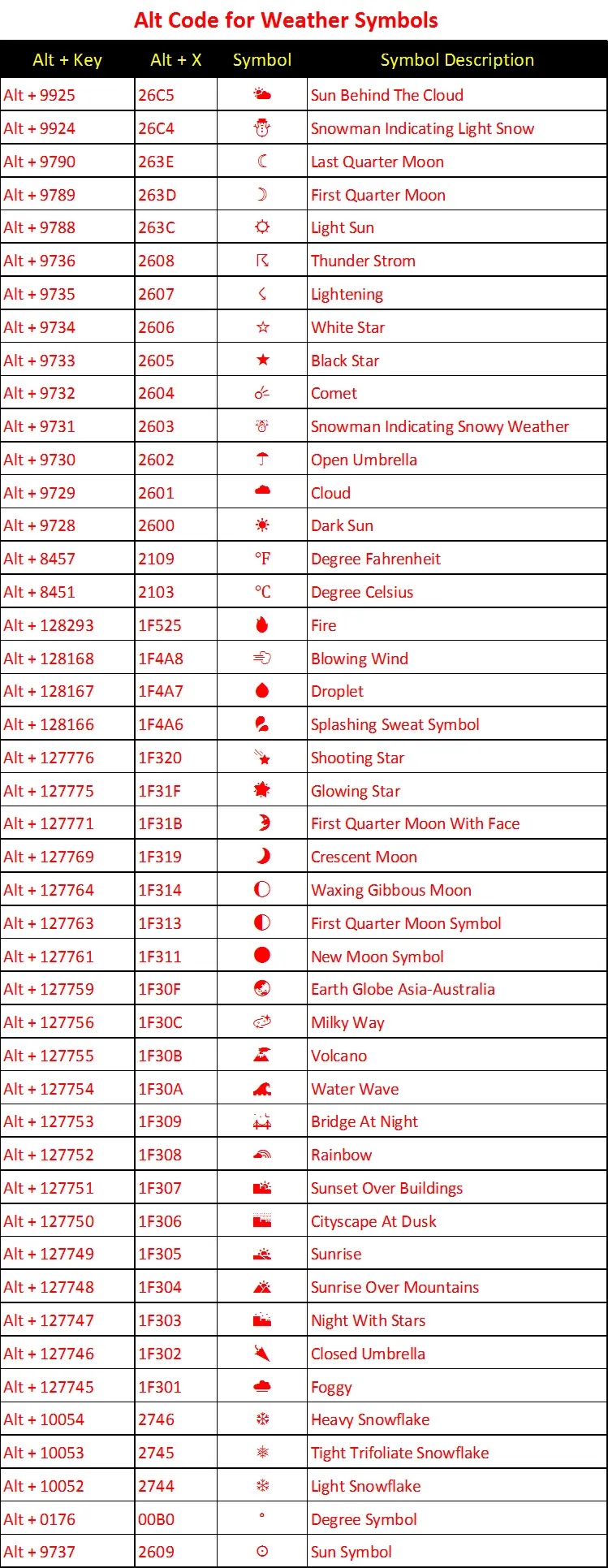 İşte hava durumu simgelerini yapmak için eksiksiz bir klavye kısayolları aşağıdaki tabloda verilmiştir.